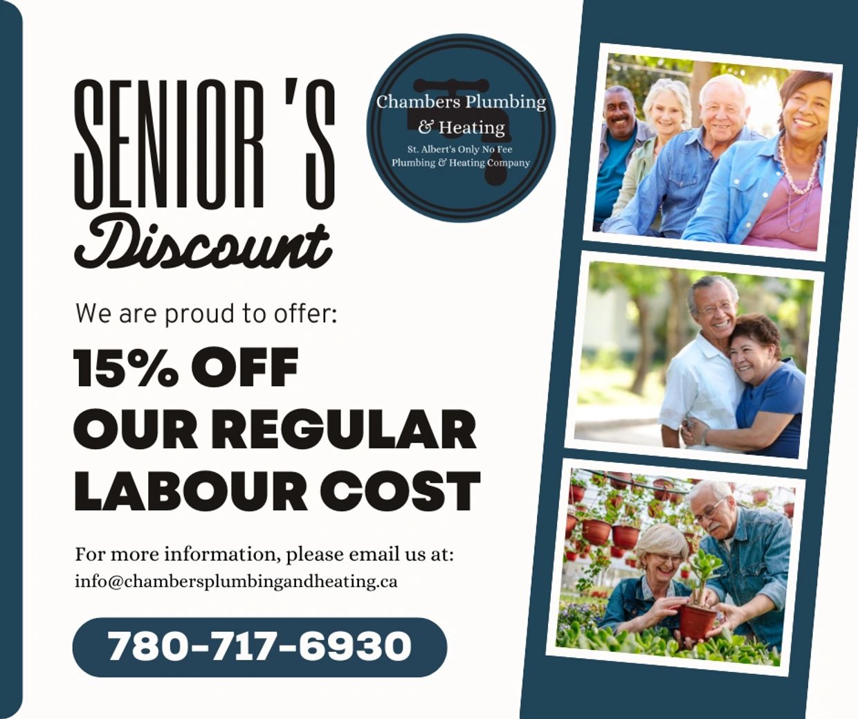 *In an effort to ensure our discount is obtained by those who truly require the financial burden to be lifted on plumbing & heating services, this discount will only apply to Seniors living on their own or as a couple. This discount does not apply to family households with seniors living with them. Thank you for your understanding!