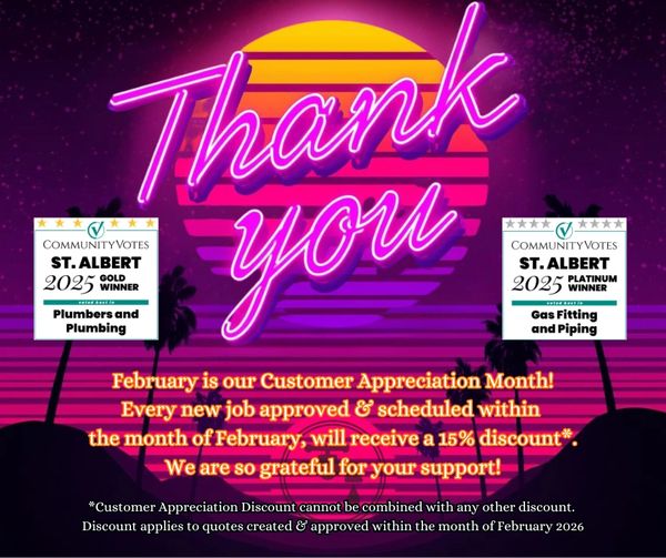 We are beyond honoured to have been awarded Platinum in the Plumbers & Plumbing, as well as the Gas Fitting & Piping Categories in the 2024 St. Albert Community Votes, for the 2nd year in a row! As a heartfelt "Thank You" to this wonderful & supportive community, we will be offering a 10% discount on ALL new services scheduled for the month of February*